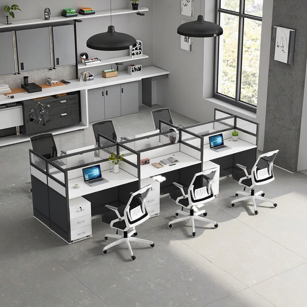 Six Individual Workspaces: Provides dedicated areas for six users with privacy panels